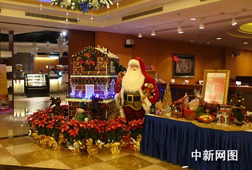 采访第四次“陈江会谈”记者入住的金典酒店大堂中的圣诞老公公。
