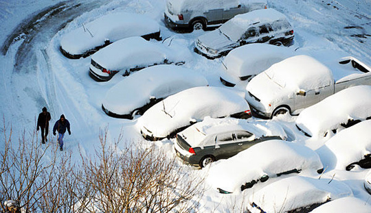 图为两名男子在积雪覆盖的停车场中行走。