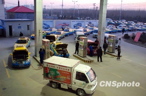12月21日,夜幕下等待加气的出租车在一加气站前排起长龙。近日,持续低温天气导致山东滨州出租车再次出现加气难现象。为了加气,许多出租车只能彻夜排队。