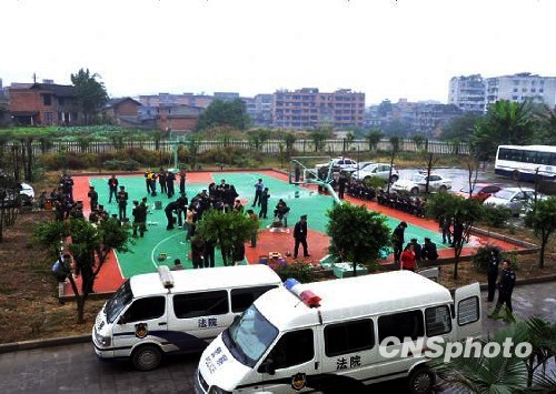 充分做好提审准备、执行现场安全警戒的法警、武警及工作人员。中新社发 杨公安 摄