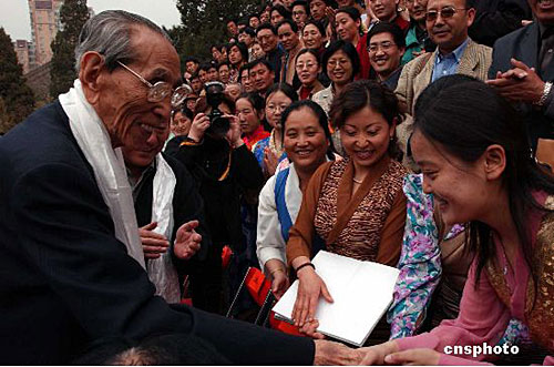 图为2003年4月1日,全国藏学暨藏语文教学研讨会在北京中央民族大学开幕,全国政协副主席阿沛·阿旺晋美到会祝贺。中新社发 张炜 摄