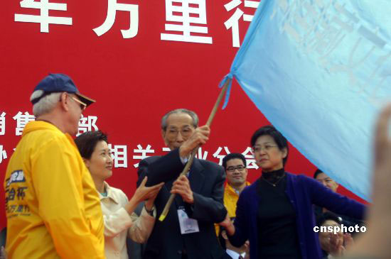 图为2002年9月20日,阿沛·阿旺晋美为“中国藏文化汽车万里行”授旗。中新社发 史利 摄