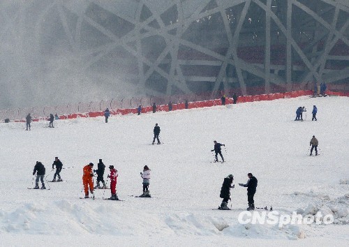 2009年12月28日,北京,“鸟巢”北侧热身场上的10米高台滑雪坡道正式开放,众多滑雪爱好者欢聚在这里驰骋娱乐。至此,经过全方位调测试,鸟巢欢乐冰雪季正式全面开放营业。