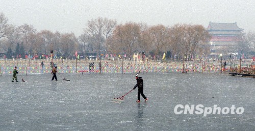 北京什刹海工人们正在对冰场进行最后的清理。中新社发 玉龙 摄