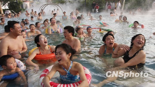 1月3日,游人在永川香海温泉边泡温泉边欣赏文艺表演。今年元旦期间,重庆市永川香海温泉宾客如织,热气腾腾的池水中游人在尽情嬉戏,处处洋溢着祥和、浓郁的节日气氛,而文艺表演队的精彩演出让游人们陶醉其中。