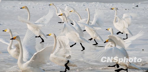2010年1月2日,山东荣成烟墩角海湾,成群的大天鹅迎着冰雪飞舞,吸引了大批的游客。