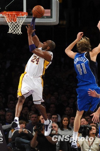当地时间一月三日晚,洛杉矶湖人队主场迎战诺维茨基领衔的达拉斯小牛队。上半场,湖人以六十四比三十九大比分领先。图为科比长驱直入灌篮得分。中新社发 张炜 摄