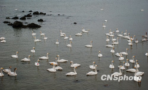 2010年元旦假期,山东荣成烟墩角海湾里的天鹅吸引了全国各地的游人。中新社发 洪晓东 摄