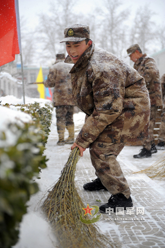 图为清扫积雪当中的新战士。雪卢鹏 史成浩 摄