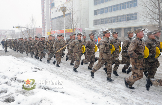 图为官兵跑步奔赴清扫街道。雪卢鹏 史成浩 摄