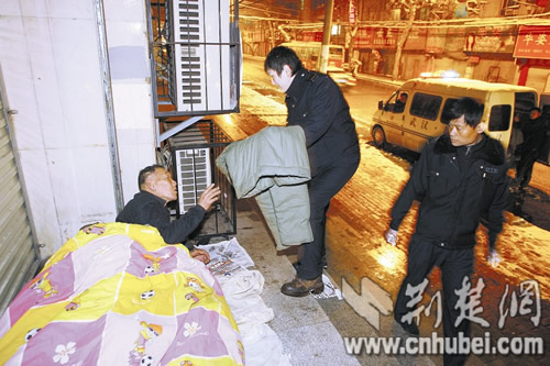 昨晚,记者跟随救助管理站的一支救助队在雪夜的街道,搜寻需要帮助的露宿者。19时许,救助队在寒流袭人的武展地下通道,发现一个“包裹”,揭开一看,一名妇女蜷缩一团,脸色发青,双手冰凉。救助人员扶起她,劝了约5分钟,她才随救助人员登上了救助车。