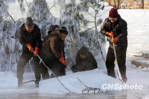 没有团结互助、吃苦耐劳的精神是完成不了每天破10公分冰层凿冰任务的。中新社发 于虤虤 摄