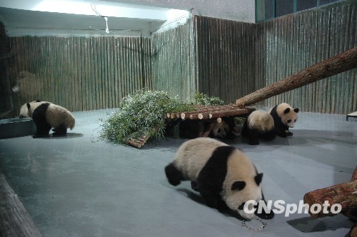 1月5日,由卧龙中国保护大熊猫研究中心精心遴选的10只“世博熊猫”经空运抵达上海,集体搬入上海动物园的新家。中新社发 阿凯 摄