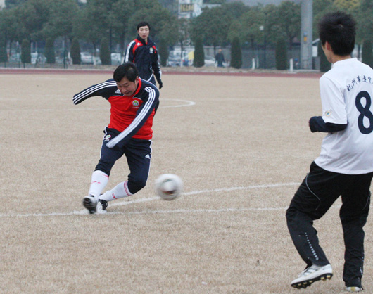 2010年1月5日,中国浙江杭州,2011亚洲杯预选赛临近,中国足协副主席南勇督战国足,并亲自登场与杭州市民切磋球技,一试身手。
