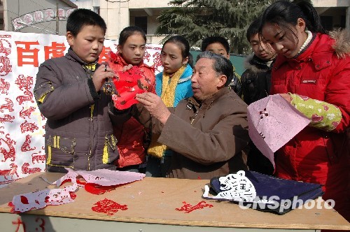 1月6日,河南省南阳市卧龙区陆营镇一中退休教师吕登阁和学生们一起创作剪纸作品《百虎迎春》,迎接即将到来的农历虎年。