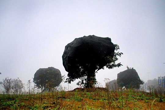 1月4日,冷空气再次袭击绵阳,在经开区机场路口一广场上,远远的望去好像“蘑菇云”,走进一看原来是几棵大树已经穿上了冬装,在大雾笼罩中向寒冷发出挑战。陈冬冬/CFP