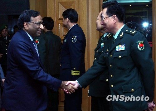 1月6日,中国人民解放军副总参谋长马晓天上将,在北京八一大楼与来访的印度国防秘书普拉迪普·库马尔共同主持了中印第三届防务安全磋商,国防部外事办公室副主任贾晓宁(右)及印度驻华大使杰尚卡等出席了磋商。中新社发 宋吉河 摄