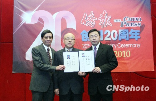 图为《侨报》母公司美国亚洲文化传媒集团董事长岑工(中)向《侨报》总裁游江(右)、总编辑郑衣德(左)转交中国国务委员戴秉国和中国国务院侨办主任李海峰为《侨报》发来的贺词。中新社发 魏晞 摄