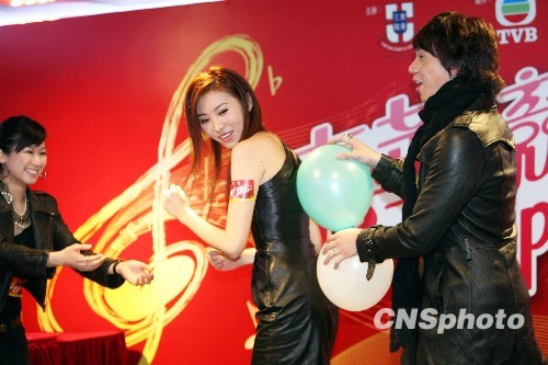 1月6日,香港人气歌手张继聪与艺人陈爽在记者会上玩游戏。当日,香港慈善机构“东华三院”举行记者会公布1月17日举行的筹款综艺节目,张继聪与陈爽等将担任晚会演出嘉宾。中新社发 洪少葵 摄