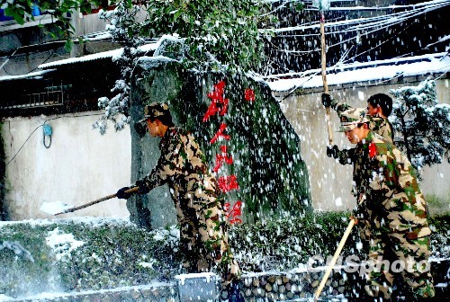 2010年1月6日,安徽休宁县武警官兵清除积雪,为市民开出“安全通道”。1月5日夜间至6日,黄山市普降大雪,积雪深度近20多厘米,给市民生活和出行带来极大不便。休宁县武警总队官兵紧急出动,连续奋战,深入街道、企业、学校、社区等地段全面展开清雪。