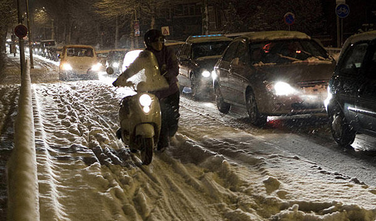 图为荷兰阿姆斯特丹一名行人推车走在雪地上。