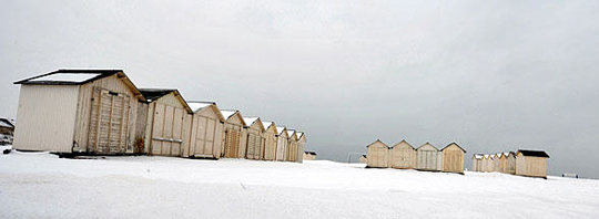 图为法国诺曼底的乌伊斯特勒昂海滩一些海边小屋被雪覆盖。