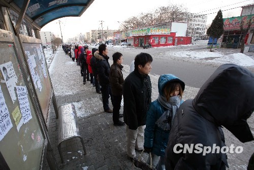 1月7日,继前一天的“最低气温-16.7℃”后,北京持续低温。大雪造成的后遗症依然存在,局部的路面结冰依旧困扰北京公交系统。图为381路公交始发站兴旺大街,赶早班等车的市民等了近40分钟依然没车,在寒风里排成了几十米的长队。中新社发 刘震 摄