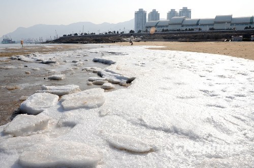 图:连云港海滨气温骤降 海水结成冰凌(2)