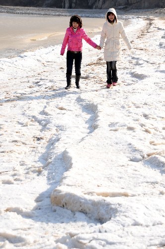 沙滩变成一片白茫茫雪地,给寒冬里的海滨增添了一道风景线,吸引不少游人前来观赏。中新社发 王春 摄