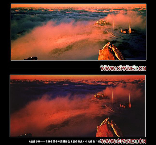 上图为:桑玉柱 气象万千 下图为:孟铁 长白山红云