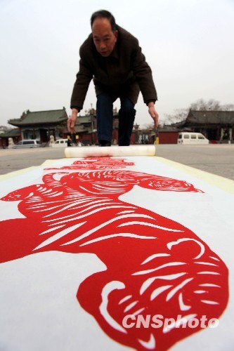 1月7日,河南省许昌市民间艺人吴遂洲在春秋广场展示《百虎图》剪纸长卷。中新社发 牛书培 摄