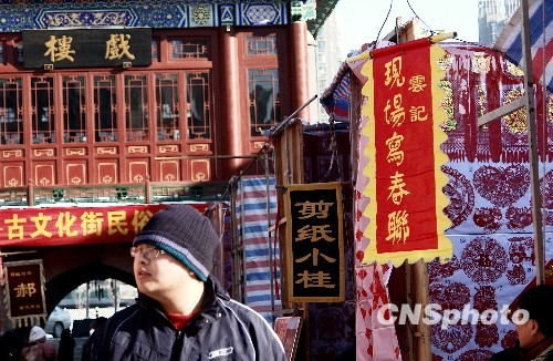 2010年1月11日,春节将至,天津古文化街传统民俗市场启动,以红色为主色调的吊钱、窗花、彩灯、福字贴纸等,使人感到春天的脚步越来越近。
