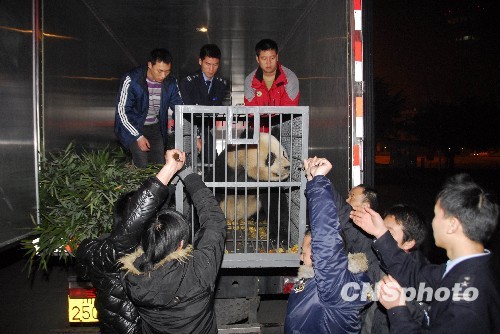 1月11日凌晨,三只大熊猫抵达成都机场宾馆,它们将从这里奔赴浙江温岭的新家。1月10日晚上22时许,四川卧龙中国大熊猫研究中心雅安碧峰峡基地,三只大熊猫开始启程前往成都。按计划,1月11日上午9时,三只熊猫将从成都双流机场乘飞机前往宁波,13时20分左右由宁波乘专车到温岭长屿硐天的新家,预计大熊猫将于下午17时前后到达温岭。 三只大熊猫去年北京奥运会期间曾在北京展出,可以说是奥运明星,它们的名字分别叫福娃、欢欢、淘淘,都是雄性,年龄都为4岁,福娃体重99公斤,欢欢体重96公斤,淘淘体重90公斤。