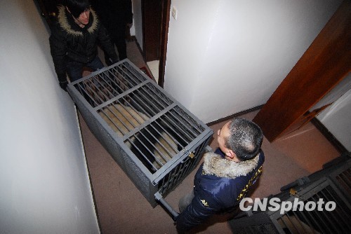 1月11日凌晨,三只大熊猫抵达成都机场宾馆,它们将从这里奔赴浙江温岭的新家。中新社发 吴鹏飞 摄