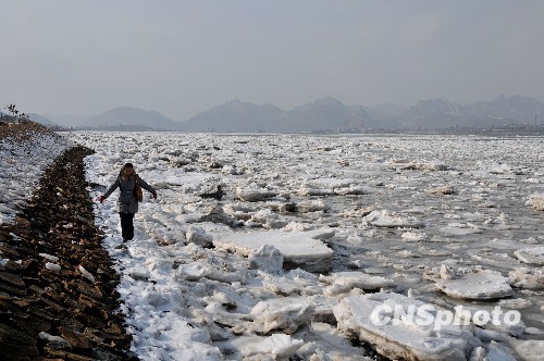 山东乳山海湾结冰,养殖户抗灾保生产。中新社发 刘国贤 摄