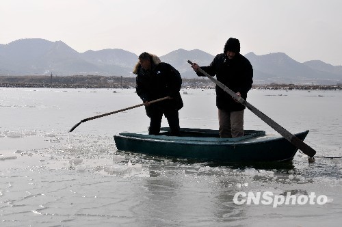 山东乳山海湾结冰,养殖户抗灾保生产。中新社发 刘国贤 摄