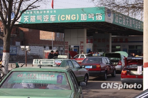 1月12日,在郑州市南三环和京广路附近的一座天然气加气站,二百多辆用气的出租车排成两队,等候加气。自去年11月份,国内很多地区出现天然气供应紧张情况,使出租车用气受到较大影响。中新社发 晏立海 摄