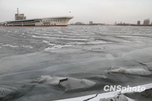 2010年1月12日,山东滨州,受持续寒潮大风天气影响,以美国尼米兹企业号航空母舰为蓝本建造的“中海航母”娱乐城,被浮冰包围。