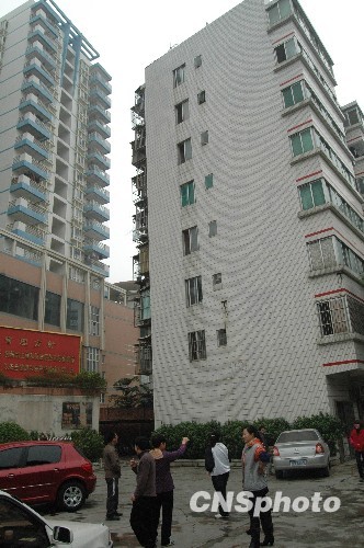 1月20日,广西南宁市北大南路4号一小区内,业主们对一栋已经发生下沉并倾斜的楼房担忧不已。业主们称,自2003年隔壁的一房地产项目开工建设以来,楼房就开始下沉并倾斜,楼内裂痕遍布,情况日趋严重。中新社发 王刚 摄