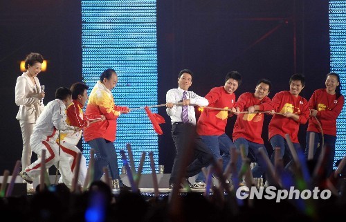 1月20日晚,举重奥运冠军石智勇(左一)、张湘祥(左二)和中国举重冠军教练陈文斌(左三)与拥有百亿身家的福建首富陈发树先生(左四)和他的员工在福州举行的欢乐中国行舞台上举行了一场别开生面的拔河秀。中新社发 王东明 摄