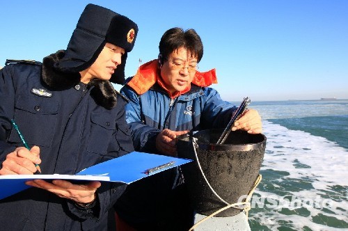 图为参加冰调任务的有关工作人员在B23测量点,正在对海水温度进行取样测量。中新社发 张雷 摄