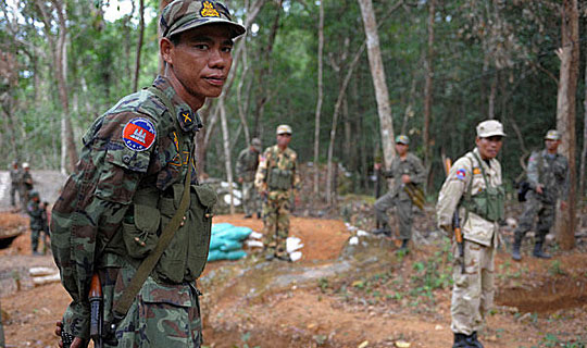 在柬埔寨首都金边以北约500公里的柬泰边境地区,柬埔寨士兵在柏威夏寺附近站岗。