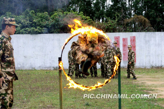 陈景看着战友们越过火圈,不禁吐了吐舌头。在入伍当兵之前,他从来没尝试过这样“高难度”的训练。难免会有点害怕,但他最终还是鼓起勇气,越过火圈,完成了训练。