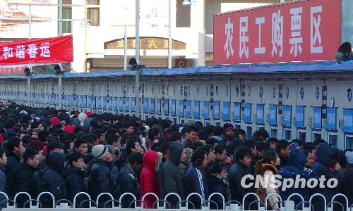 北京西站临时售票处人如潮。中新社发 玉龙 摄