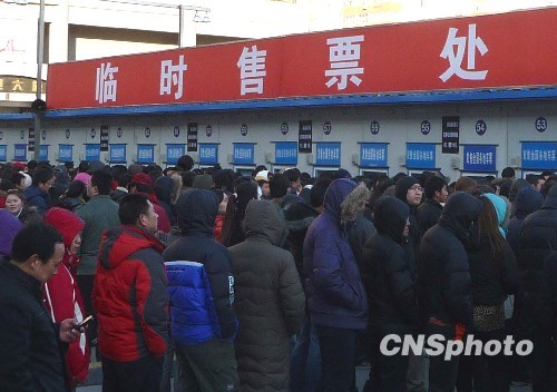北京西站临时售票处人如潮。中新社发 玉龙 摄