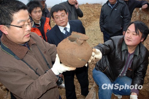 考古队员对水泉镇西汉墓葬群新出土的陶器进行初步鉴定。中新社发 刘明祥 摄