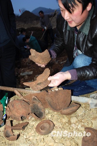 考古队员对水泉镇西汉墓葬群新出土的陶器进行初步鉴定。中新社发 刘明祥 摄