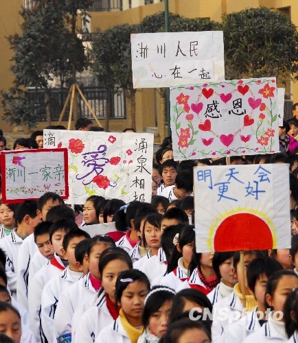 图为2月1日上午,参加四川省青川县木鱼镇中小学将举行落成交付仪式的同学们举着牌子表示感谢。中新社发 吴鹏飞 摄