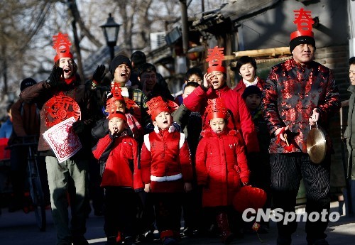 北京东四的胡同里“春官”走街串巷,高喊着“春来了”,北京民间报春活动在这里热闹上演。中新社发 杜洋 摄