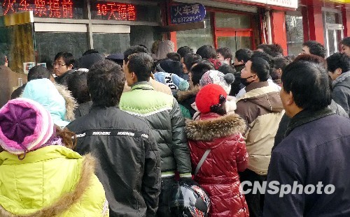 2月3日,正值春运繁忙时刻,众多在北京等候返乡的农民工和学生在各城区的机票、火车票销售点排长队等候购票,几名农民工早晨5点就来到火车票销售点等候买票。图为京城一家车票销售点前返乡的农民工学生排起长队。中新社发 钱兴强 摄